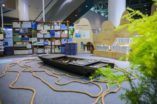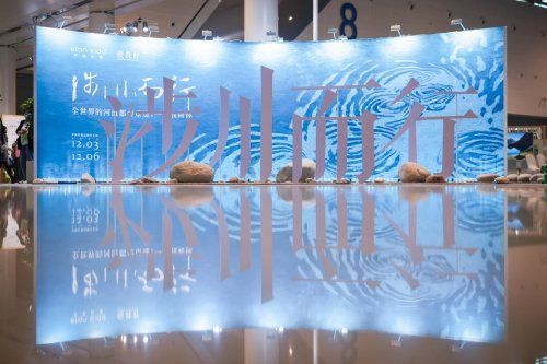 会场一隅,伊顿纪德品牌艺术展“涉川而行·全世界的河流都会重逢,一如我和你”以河流、岛链、涟漪为核心意象,串联起“一滴水的澄澈与明亮”“一方池塘的共生共茂”“所谓伊人,在水一方”“打开明亮的日常”四段旅程,以“文以载道”与“衣以载道”为线索,以行动致敬美好教育。