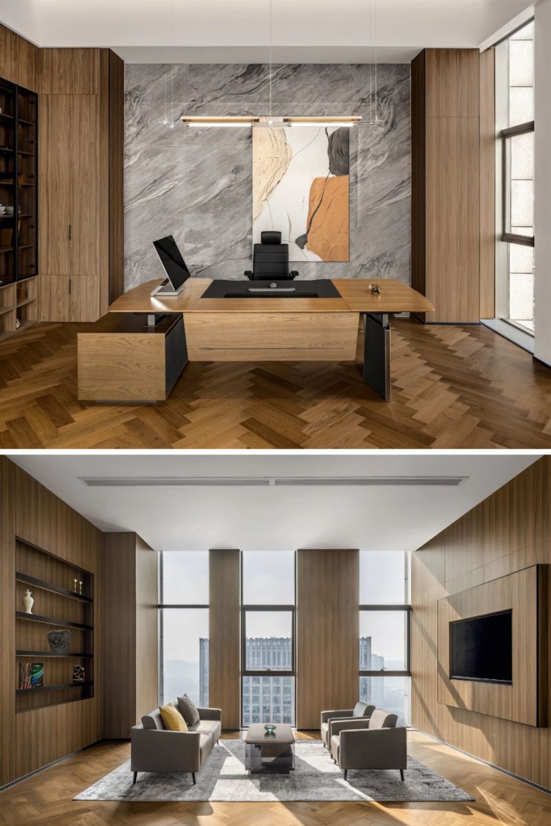 在主管办公区内,设计师以简洁的木饰面构筑沉稳的商务场景,兼顾管理决策与高校沟通的需求。