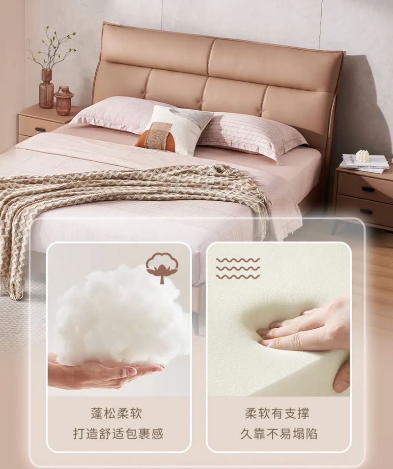 穗宝集团梵洛贝在材质选择上同样秉持严苛标准,力求兼顾舒适触感与长久耐用。外层选用头层黄牛皮胚料,优选疤痕少、皮质紧实的优质皮张,最大程度还原头层牛皮的天然肌理,让床体外观立体饱满,触感细腻温润。内层创新填充7孔纤维棉与高密度海绵组合,两种材质的精妙融合,让靠包兼具饱满蓬松的触感与持久回弹的特性,即便长期倚靠也不易变形塌陷,完美平衡实用性与舒适感。