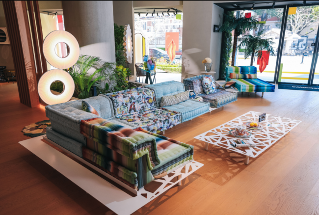 展览现场,Mah Jong 沙发 Missoni 版还以极具创意的“贪吃蛇”式组合方式呈现:多个模块在空间中连续蜿蜒延展,如同一条灵动游走的色彩轨迹,在开阔空间中形成流动的视觉路径。这种顽皮布局既展现了 Mah Jong 高度自由的特性,也让观者在行走之间不断发现新的空间节奏与视角。