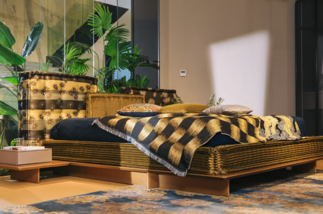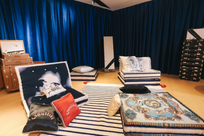 与“时尚顽童”Jean Paul Gaultier 的合作版本,则展现出另一种大胆率真的设计态度。JPG 将其标志性的水手条纹与高级时装面料结合,为Mah Jong“麻将”沙发赋予鲜明的个性印记。现场宛如一场正在进行的时尚大片拍摄:沙发模块与抱枕自由散落于地毯之上,与其为罗奇堡设计的其他家居单品彼此呼应,在空间中交织成一场关于时尚、设计与生活方式的对话。