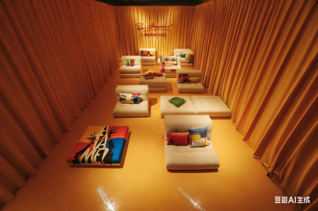 行至三楼,进入阿莫多瓦的金色帷幕。这一由导演亲自选定的色彩将空间塑造成沉浸式电影院。新品Lounge Pedro Almodóvar 沙发错落散置于其间,如随性的观影坐席,让观者自然融入阿莫多瓦的电影宇宙——色彩浓烈、情绪爆满、叙事张力十足。在此,家居已化身为承载叙事的艺术媒介。