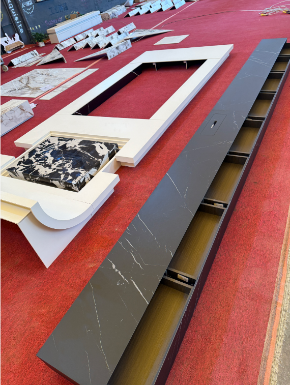 谢甫青说只做实实在在的定制加工,不做自有品牌销售,可以覆盖918到1.8m×3.2m全规格岩板加工,承接异形岛台、餐台面、餐边柜、楼梯踏步、厨房台面复合蜂窝铝等各类定制。