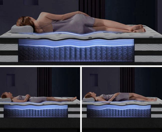 • 轻体重人群:两端柔性贴合,中段适度支撑,舒适包裹不压身; • 大体重人群:中段加粗强化承托,稳稳承压防塌陷,两端依旧保持柔和缓冲; • 多睡姿适配:仰睡、侧睡、卧睡自由切换,实时跟随受力点调整支撑力度,持续舒缓久坐、久站引发的腰肌劳损,长效保护脊柱健康。