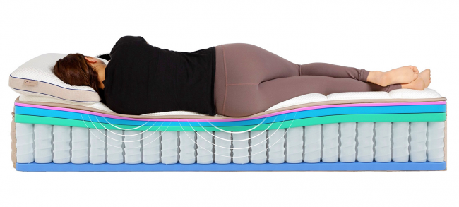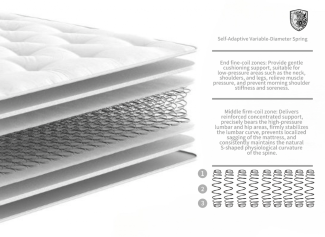 • 两端细圈区域:柔和缓冲承托,适配肩颈、腿部低压受力部位,舒缓肌肉压迫,杜绝晨起肩颈僵硬、酸痛; • 中间粗圈区域:强化集中支撑,精准承托腰臀高压受力区,牢牢稳固腰椎线条,防止床垫局部塌陷,时刻维持脊柱自然S型生理曲度。