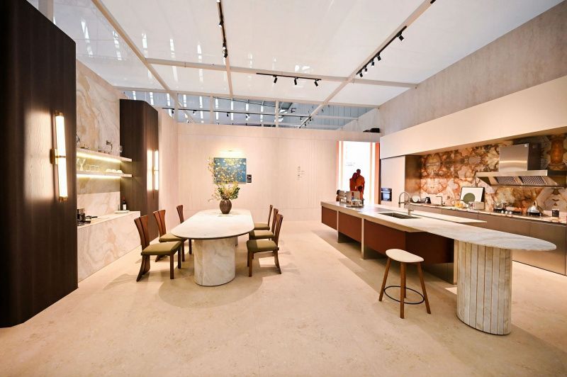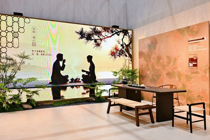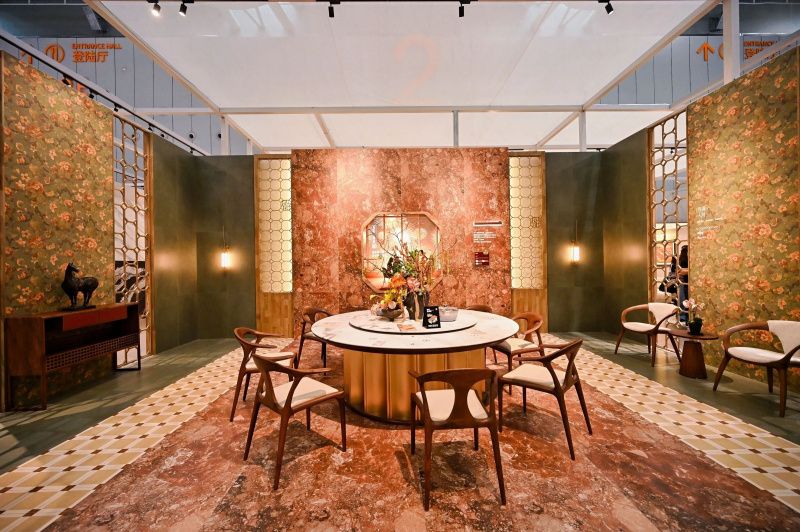 作为冠珠高端岩板新品的首个宅院应用示范,「冠珠华韵高端岩板主题馆」以“中国节律”的东方文化智慧为脉络,采用“前院后宅”的格局,构建“一境一时辰、一境一故事”的空间叙事。观众层层深入,移步换景间,感受东方人居的时空诗学,重新找回属于中国人的时间感知与社会生活节奏,获得沉浸式的文化体验。深入冠珠华韵岩板的应用探索,冠珠瓷砖以演绎一日之内、多元功能居室、十二时辰轮转的东方栖居哲学,充分展示了华韵岩板在墙、地、台全案应用中的多元性,彰显了产品在高端定制领域的空间可塑性。可以说,展会上呈现的冠珠华韵岩板落地方案,已具备直接复制到终端展厅、门店乃至消费者家中的能力。