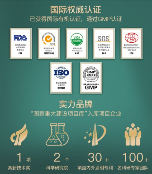 7大权威机构认证,如原产地地理标志认证、ISO9001认证、GMP认证、FDA认证、NOP认证、SGS认证、ECO认证、等,品质共同见证。