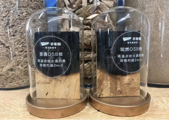 千年舟集团不仅有千年舟实木切片OSB生态板,还推出了具有阻燃功效的OSB板。目前,市面上现有的阻燃板材大多采用单板浸泡的方式达到板材阻燃的效果,这种方式处理的单板如后期烘干不到位会影响板材的质量,如开胶、变形、龟裂等质量问题。