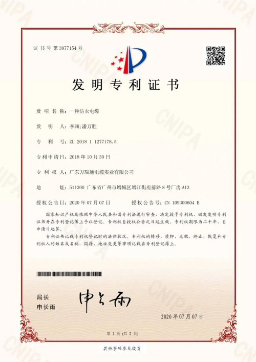 近日,广东万瑞通电缆实业有限公司申请的国家发明专利——“一种防火电缆”和“一种防水电缆接头” 两项发明专利成功通过国家知识产权局审查,获得国家知识产权局发明专利的授权,这是万瑞通电缆在自主研发科技创新方面取得的喜人成果。