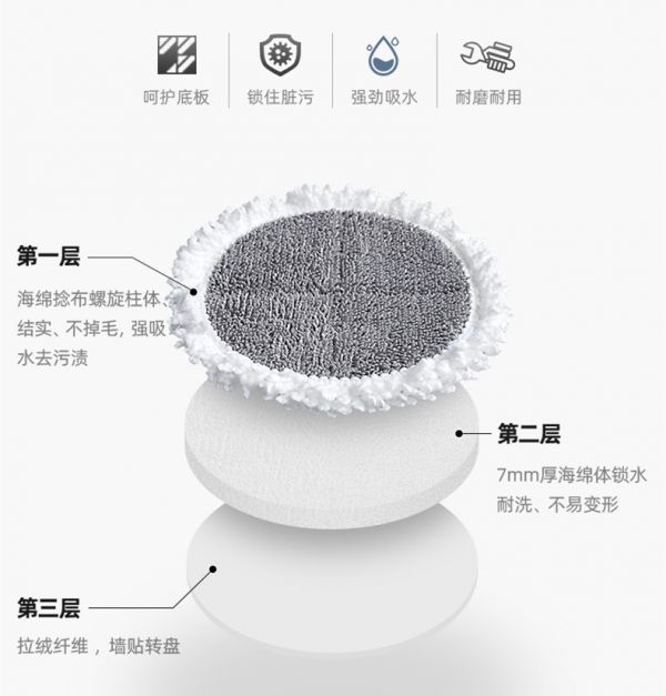 在拖布设计上,法博莱无线电动拖把FBL-711采用了纳米级的特殊纤维设计,由三层组合而成。第一层为海绵捻布螺旋柱体,第二层为7mm厚度的海绵体,第三层为拉绒纤维。三层强强联合,强劲吸水锁污,只留洁净。值得一提的是,拖布的清洗只要将它放置在倒有清洗液的清水中浸泡即可,脏污会自动脱落浮出,还原拖布本来洁净。