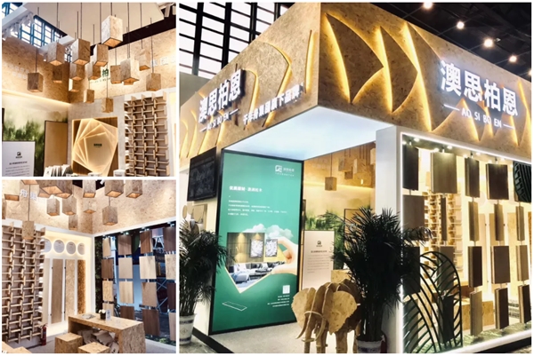 展会上,最吸睛的要数澳思柏恩实木切片OSB板。澳思柏恩展馆内展样丰富,有“木块”悬挂方式,有“不规则”组合形式,极富立体感、层次感。多样的展现形式,不仅展示了OSB板无醛添加、可塑性高、物理性能强等特点,还将其特殊的刨片形态、色泽一一呈现。同时,现场还展示了LSB板、无醛级澳松板、阻燃OSB板,将澳思柏恩板材“源于自然、胜于自然”的特性展现得淋漓尽致!