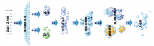 仔细了解光催化的科学原理发现,通过特定的波长光线照射,激活纳米光催化剂,生成电子空穴对,使光催化剂与周围的H₂O分子、O₂分子发生作用,结合生成氢氧自由基OH,通过氢氧自由基层OH层层锁住空气中各种有害成分,分解有害成分构造,抑制细菌生长和病毒活性能力,从而达到杀菌、空气净化、除臭、防霉、消除空气污染的目的。