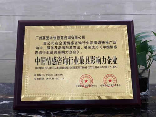 2019年5月,广州真爱永恒教育咨询有限公司成功被中国优选品牌促进发展工程评选为“中国优选品牌”,并授予真爱永恒“心理教育咨询行业优选品牌”称号。
