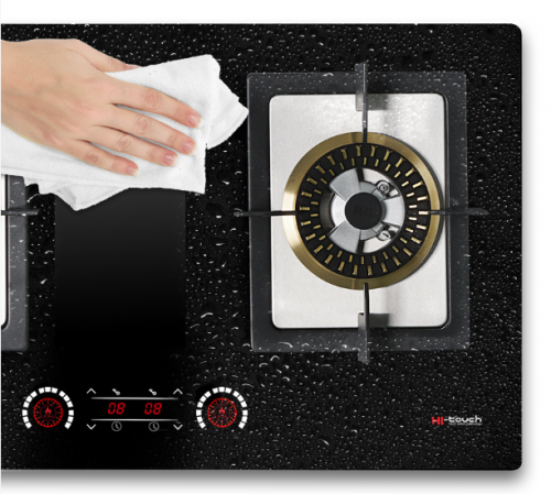 在火王门店,能够直观看见火王触屏灶表面是一块黑晶玻璃面板,没有任何缝隙,光滑的像一面镜子。同时炉头也采用人性化设计,易于拆卸和安装,这样一来,整个火王触屏灶表面就十分平整,天生具备防水防污的条件。