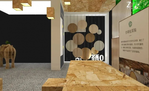 本次展会,澳思柏恩展厅整体均以本品牌的主打产品OSB板为主材,整体风格中西结合,既有本土的内敛又与国际时尚接轨。外立面门头部分以OSB板为主要呈现元素,并采用多种形式进行呈现。