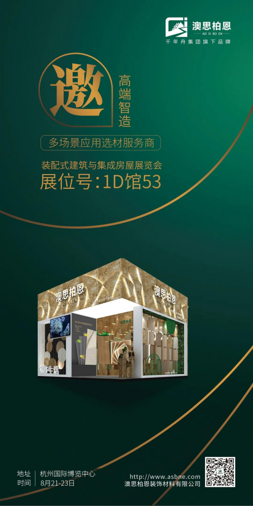 2020年8月21日-8月23日,杭州装配式展将在杭州国际博览中心举办。作为环保建材的推动者,澳思柏恩携自主研发与制造,同时匹配未来环保趋势的明星产品OSB板、LSB板,以及无醛级澳松板、阻燃OSB板等亮相展会,聚焦品牌赋能,定义高端智造的生活方式,一展基材前沿风尚。