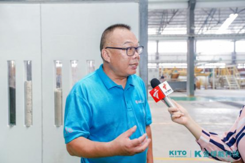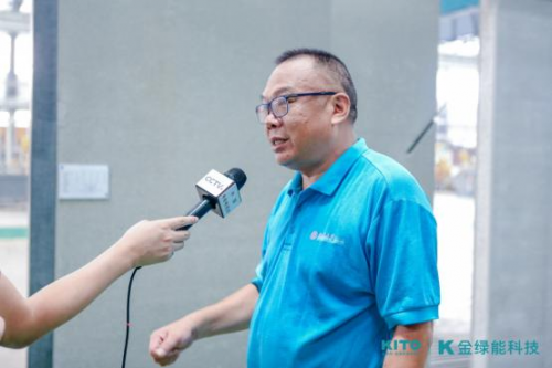 ▲金意陶董事长何乾在金绿能新材示范基地接受中央电视台记者采访