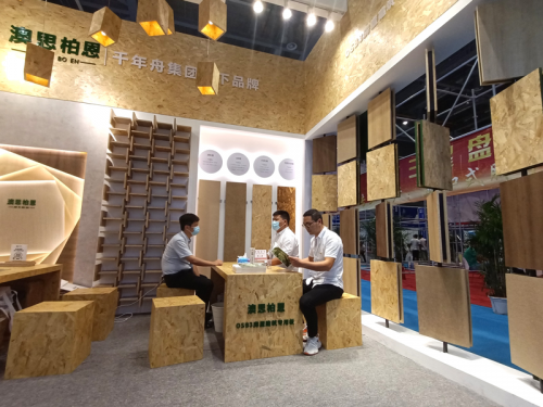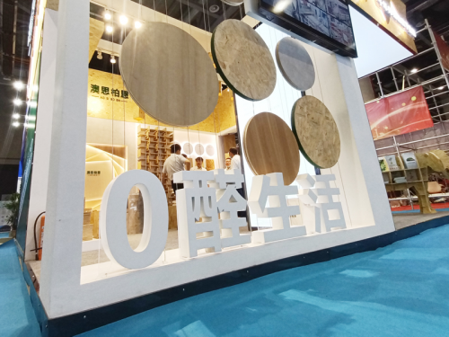 展会现场,澳思柏恩自主研发制造的明星产品 OSB 板、LSB 板,以及无醛级澳松板、阻燃 OSB 板等亮相展会。多样的展现形式,不仅展示了 OSB 板无醛添加、可塑性高、物理性能强等特点,还将其特殊的刨片形态、色泽一一呈现。同时, LSB 板、无醛级澳松板、阻燃 OSB 板“源于自然、胜于自然”的特性,也展现得淋漓尽致。