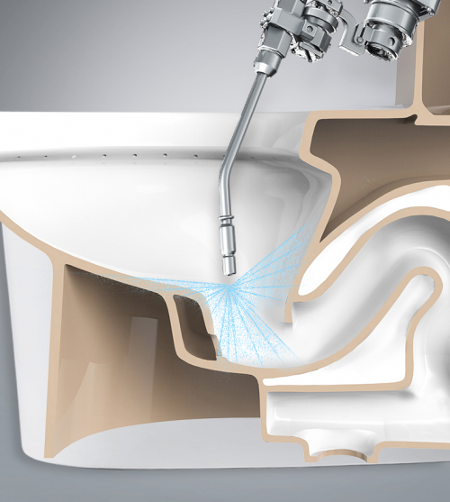 卡贝采用的是喷射虹吸式冲水,这种方式借助较大的水流将脏污推入管道内,加大了虹吸作用,加快了排污速度。池内的存水面积大,防臭、防溅的效果都很好,还降低了噪音。