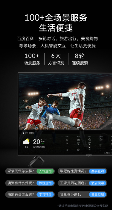 传统电视需要用到遥控器去换台,有时候中间跨度大的话需要点按很多次,对于在沙发上抱着零食的观看者来说,体验感是很糟糕的。而创维V40智能电视内置语音助手小度,换台或者播放音乐只需要一句话搞定,是不是觉得方便了很多呢!那小度助手有哪些优点呐?100+全场景服务,百度百科,多轮对话,旅游出行,美食购物等等多个场景,例如:深圳天气怎么样?欧冠的比赛情况?澳洲有什么好玩的?王府井周边酒店?海豹用英语怎么说?音量调小到15?小度还支持6大方言识别,让你与小度轻松对话。人机智能交互,让生活更便捷!