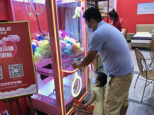 逛产品逛累了,不妨转换下心情。现场还有夹娃娃机等游戏免费提供,现在关注以下东宝床垫官方微信号和公众号还可免费领取5个夹娃娃币,趁着家博会还没结束,和大家一起逛得开心,玩得尽兴。