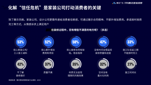 据《2019腾讯家装行业洞察白皮书》调查分析,在装修过程中有53%的人担心装修公司/工人偷工减料,有52%的人担心额外增加费用和项目,有37%的人对质量感到不满,同时还有33%的人对延误工期感到不满意。