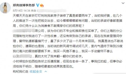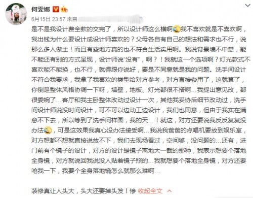 除了郑爽,2008年北京奥运会蹦床冠军何雯娜今年也同样遭遇了装修烦恼,她多次通过微博曝光无良装修公司的不当行为,控诉对方在收到全款后,没有按照她的意思设计,并对所有设计修改要求均以“不行、不能、没有”等用词直接拒绝。想必何雯娜也是心力交瘁,后悔选择了这么一家不靠谱的装修公司,最后只能在微博喊“惨”。