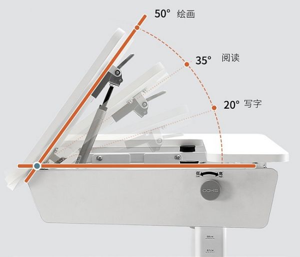 调节方面,西昊三栖书桌桌面高低可控,通过简单操作杆就可实现55cm-78cm上下自由升降,从而适应不同年龄段身高儿童。桌面板0-50°角度范围内任意锁定,0-10°用来写作业;20-40°阅读;50-60°绘画使用,一桌同时满足多种功能场景应用。