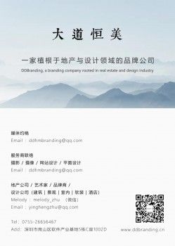 大道恒美是植根于地产与设计行业(地产|建筑|景观|室内|软装|艺术),专注于品牌战略、品牌传播、营销管理和品牌设计的新型服务机构。大道恒美以前瞻性品牌定位为灵魂,以策略性的品牌策划及传播,创意性的品牌设计,服务众多地产与设计类知名公司,为客户树立在行业中一流的品牌形象并持续增值。