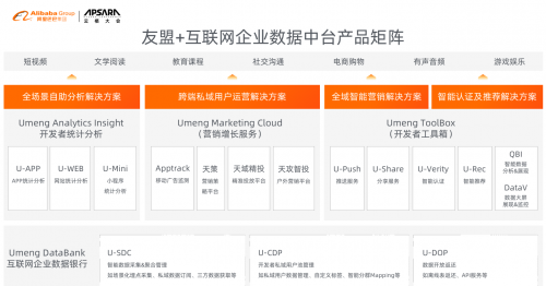 在过去的十年中,友盟+服务了890万网站和200万App。凭借服务千万家企业的经验,友盟+面向企业推出互联网企业数据中台解决方案。通过开发者统计分析服务、营销增长服务以及开发者工具箱,为企业提供智能化数据服务及增长体系。同时,基于所有数据服务的底座——友盟+互联网企业数据银行,通过多端数据沉淀,帮助开发者完成全场景、全触点的数据资产沉淀及应用的管理。整个体系将为企业的业务数字化、决策数字化、营销数字化和运营数字化提供源源不断的动力。