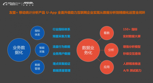 目前,友盟+的移动统计分析产品U-App已经上线了行业指标体系、智能采集方案等功能,实现流量行为数据和业务用户数据整合的同时,也提供了非常强大的数据质量管理能力。友盟+移动统计分析U-App在可为企业提供150万+基础业务指标的衡量能力基础之上,与阿里云合作,为企业提供数据实时大屏,全方位为企业打造实时数据分析和洞察。从企业的业务需求来看,友盟+移动统计分析U-App从基础指标统计、到高级分析洞察,再到人群的运营触达,完全满足互联网企业开发者利用数据驱动业务的能力诉求。辅助业务增长,助力业务迈入发展新阶段。