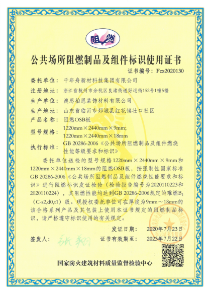 澳思柏恩阻燃OSB板,采用最新磷氮复合环保型阻燃剂(通过SGS有机挥发物权威检测)。成品板材通过国家防火建筑材料质量监督检验中心检测,获得公共场所阻燃制品及组件标识使用证书,符合国标GB 8624-2012标准B1(c-s2,d0,t1)级要求,单体燃烧、可燃性、烟气毒性等级(WX)检测均合格。
