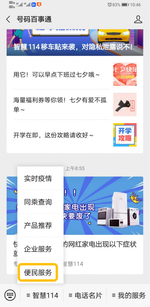 点击菜单栏:智慧114-便民服务