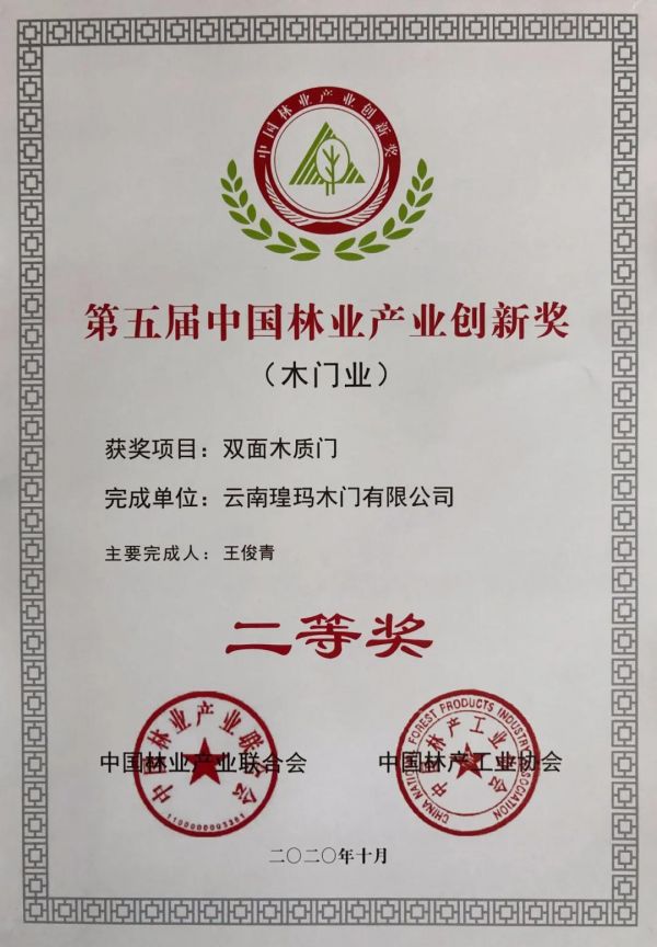 第五届中国林业产业创新奖(木门业)颁奖仪式,每二年一届此届最高奖项为二等奖,云南瑝玛木门有限公司荣获此届最高殊荣.