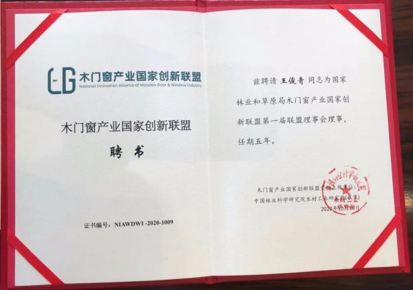 王俊青同志被聘请为国家林业和草原局木门窗产业国家创新联盟