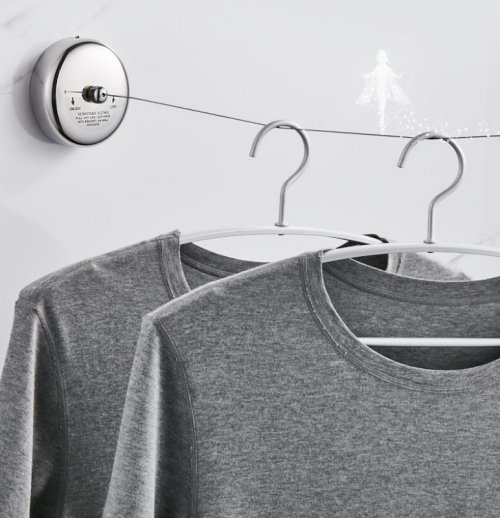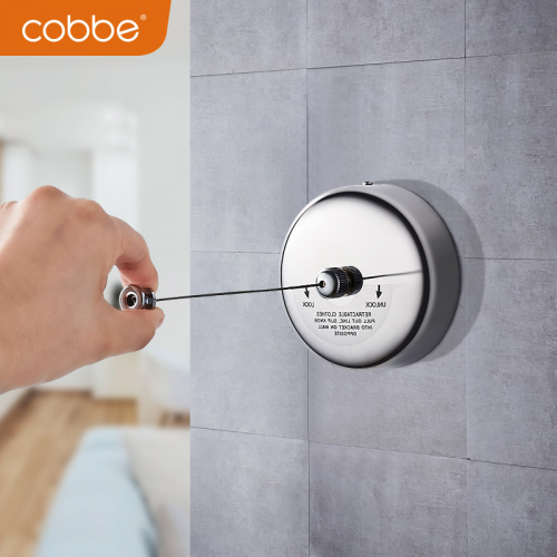 卡贝可收缩隐形晾衣绳了解一下。使用的时候,将晾衣绳抽出,拉到合适长度后,挂在另一端的挂扣处,一键锁紧。这样就可以晾晒衣服啦!