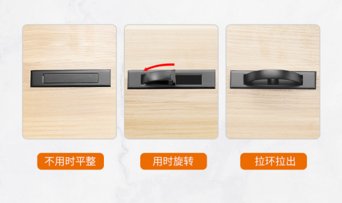 卡贝这款隐形拉手采用了嵌入式、可旋转的设计。不用的时候隐藏,呈现出平整的状态,需要用的时候旋转将拉环拉出。这种设计使拉手不容易落灰,同时弱化拉手的存在感,使柜面整体观感整洁利落。