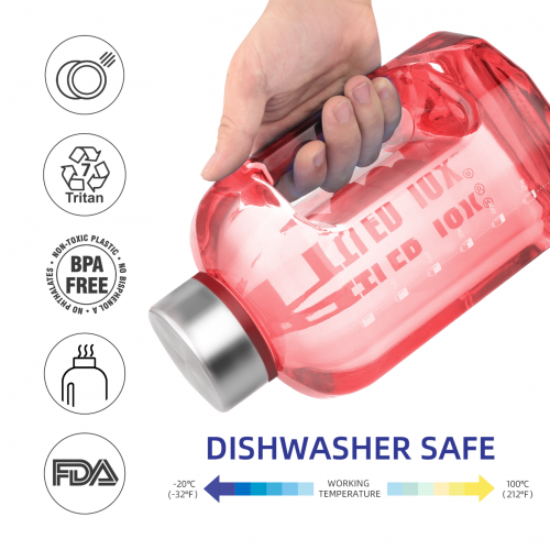 在瓶身上,还贴心标有喝水时间刻度,按早上7点至晚上7点的时间进行平均排列,可以提醒使用者及时为身体补水水分。此外,水壶的手柄设计符合人体工学,握感舒适,单手就能拿取,十分方便使用者饮用。