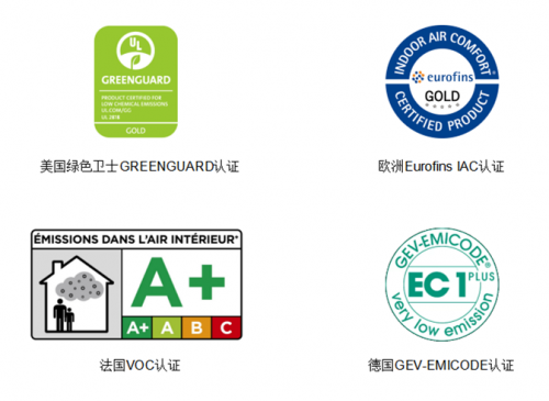 美国绿色卫士GREENGUARD认证、欧洲Eurofins IAC认证、德国GEV EMICODE认证以及法国VOC法规认证,是对产品使用后在室内或人类生活及环境中的释放量检测,是当今世界四大严苛的环保认证。