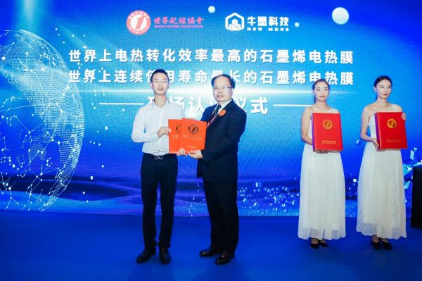 在认证仪式上,牛墨科技石墨烯电热膜以99%的电热转化率和97885小时的连续使用寿命,成为世界上“电热转化效率最高”和 “连续使用寿命最长”的石墨烯电热膜,顺利创造世界纪录。测试得到了世界纪录协会的权威认证,并获得了由世界纪录协会高级认证官张健颁发的“世界上电热转化效率最高的石墨烯电热膜”和“世界上连续使用寿命最长的石墨烯电热膜”世界纪录认证证书,以实力问鼎石墨烯智能采暖领域。