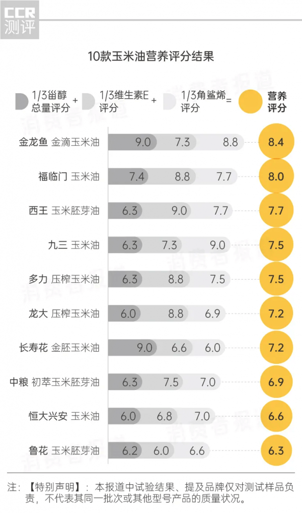 4、综合而言, 鲁花玉米胚芽油的甾醇总量、维生素E、角鲨烯等3个营养指标的含量均几乎垫底,营养评分仅有6.3; 金龙鱼金滴玉米油和 福临门玉米油营养评分分别达到8.4和8.0,表现较优。