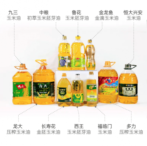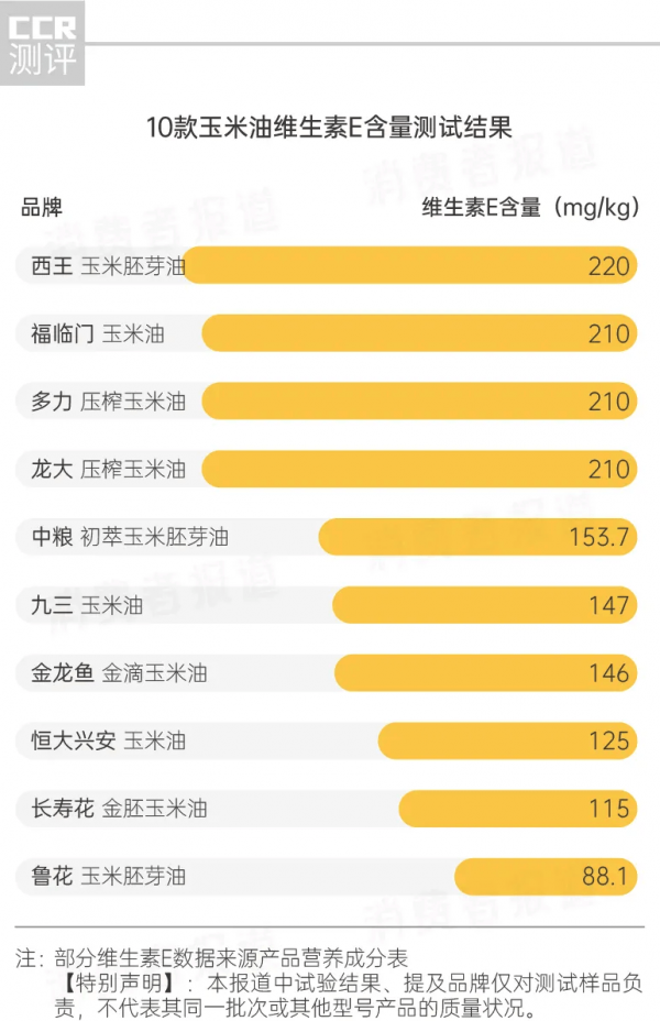 九三玉米油、 长寿花金胚玉米油、 恒大兴安玉米油、 金龙鱼金滴玉米油、 中粮初萃玉米胚芽油的维生素E含量则在115mg/kg~153.7mg/kg。