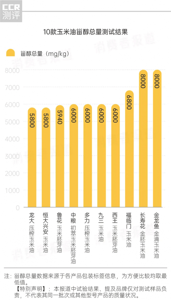 测试结果显示, 金龙鱼、 长寿花等2款玉米油的甾醇总量最高,均达到了8000mg/kg; 鲁花、 恒大兴安及 龙大等3款较低,分别为5940mg/kg、5800mg/kg和5800mg/kg。