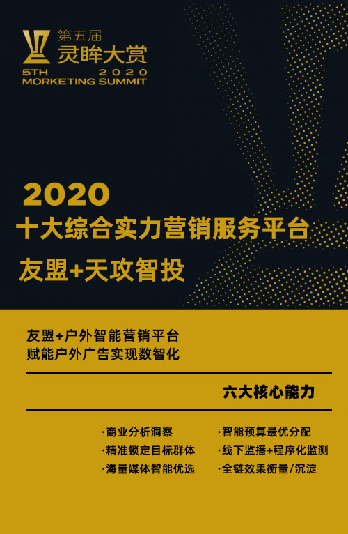 11月26日,在一年一度的Morketing Summit灵眸大赏上,友盟+户外智能营销平台—天攻智投凭借在户外数智化营销领域的优秀表现,荣获 “2020十大综合实力营销服务平台”殊荣。
