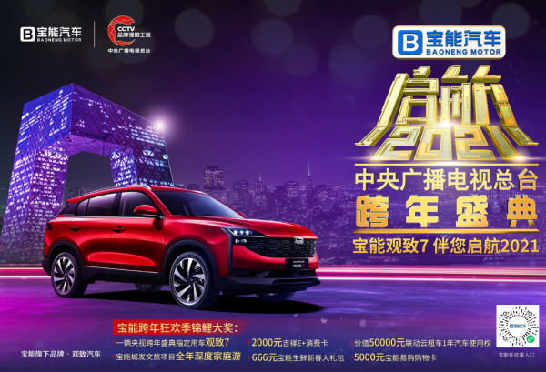 2020年即将过去,辞旧迎新的跨年夜,阖家团圆齐坐电视机前,共同欣赏跨年晚会迎接新年,是一件温馨幸福的事情。近日,宝能汽车携手中央广播电视总台正式对外官宣,宝能汽车将独家冠名《启航2021——中央广播电视总台跨年盛典》,为全国人民在岁末奉上一场感官盛宴。