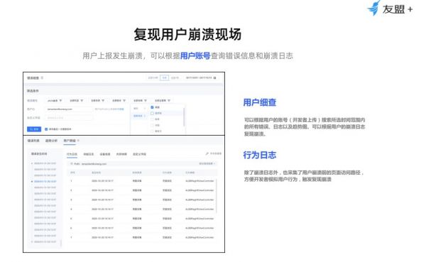 U-APM为此提供了行为日志、用户错误细查的功能。行为日志是由自动采集的页面信息组成的,方便开发者根据用户崩溃时的前项页面路径,来定位和发现崩溃现场。用户错误细查可以根据用户的账号(开发者上传)搜索所选时间范围内的所有错误、日志以及趋势图。可以根据用户的崩溃日志复现崩溃。