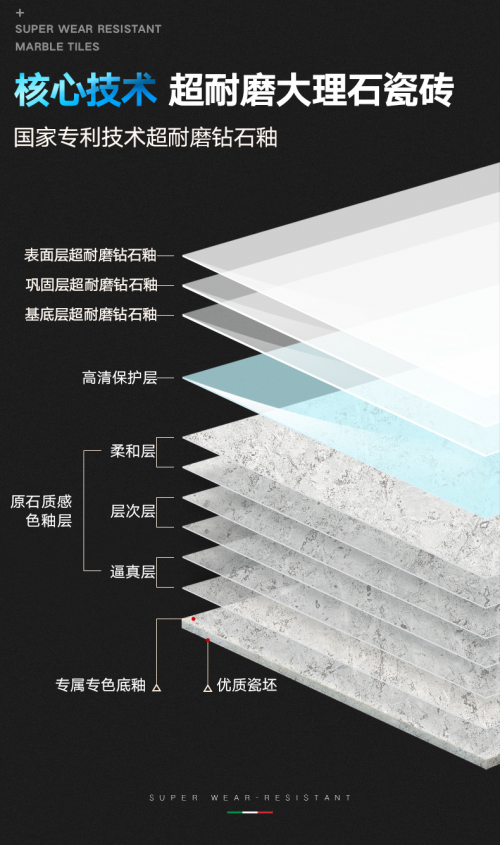 而大角鹿则不同,其察觉到市面上瓷砖不耐磨不美观等痛点问题,率先对瓷砖耐磨度提升展开深入研究,开创超耐磨技术,并取得“超耐磨钻石釉”国家专利技术认证,率先推出全球首款超耐磨大理石瓷砖,将瓷砖耐磨度直接提升4级以上,耐磨系数则达到普通瓷砖的三倍。这一突破性的技术开创成为大角鹿决胜瓷砖行业的里程碑式标志之一。