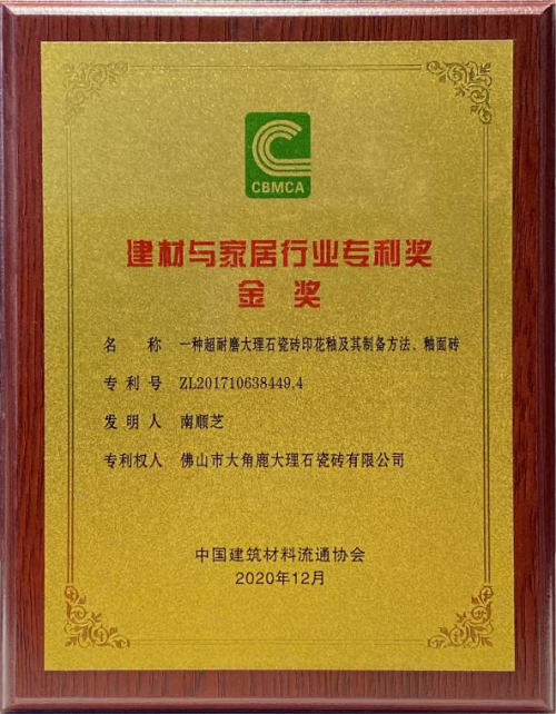 2020年12月,大角鹿瓷砖荣获2020年中国建材与家居行业专利奖•金奖和中国建材家居•2020特殊贡献奖两大奖项、2020消费者信赖十大瓷砖品牌、2020陶瓷一线品牌等众多奖项。