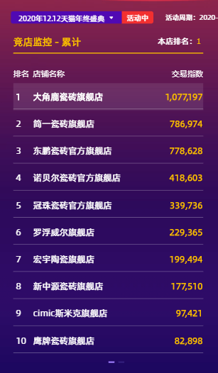 作为12月不容错过的“双12”购物盛典,为中国国民经济创收注入了一剂强心剂。中国陶瓷行业“新零售”的故事也在“双12”购物节中继续上演——中国瓷砖新锐领先品牌:大角鹿超耐磨大理石瓷砖,在今年“双12”全球购物狂欢季中再创佳绩,以1077197累计交易指数成功斩获天猫“双12”陶瓷类销量第一,成为实至名归的“瓷砖之王”。