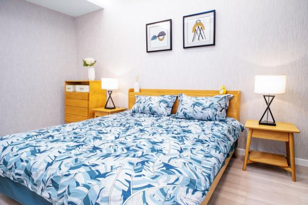 全包圆在此款设计中注入更多“清新”元素,其主色调以原木色为主,配白、灰、蓝等淡系色调为辅,色泽柔和,气韵清新,一进家门,犹如立时便将城市的浮躁、喧嚣拒之门外,亲近于自然。与此同时,为增强居住质感,“挪威森林”采用北美进口FAS级白橡木家具,瞬间将品质与品味提升一个档次,而保持了原木纹路与色泽并搭配以现代设计感的家具,质朴与灵动同具。